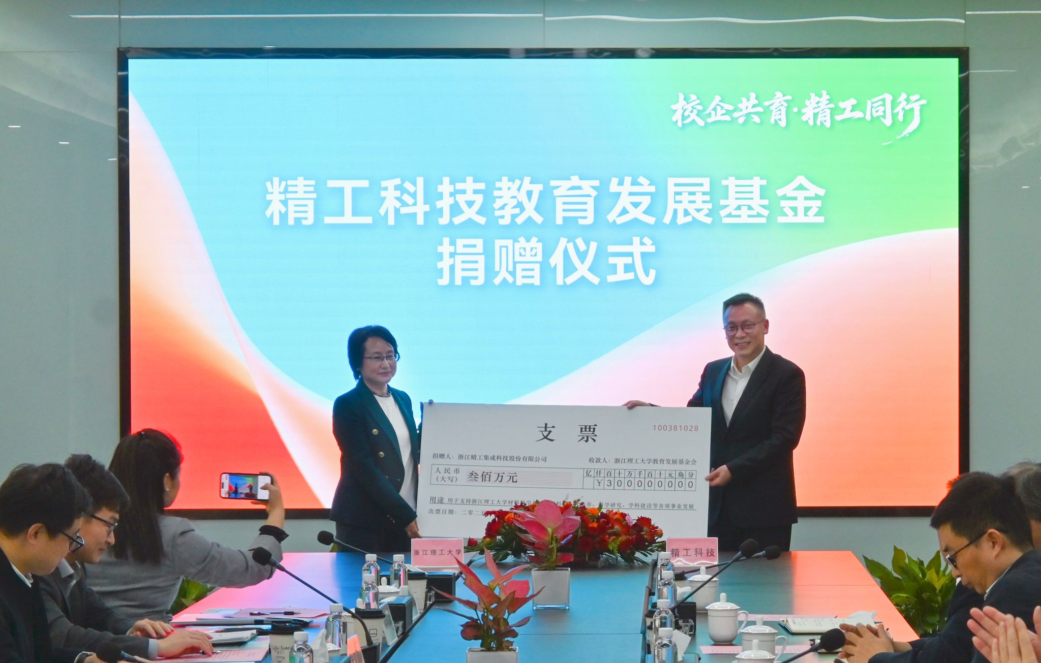 仪式上,孙国君代表精工科技向浙江理工大学捐赠300万元,设立“教育发展基金”,用于支持材料科学与工程学科人才培养、科学研究、学科建设等各项事业发展。精工科技与浙江理工大学材料科学与工程学院签订教育基金捐赠协议,姚珺代表学校接受捐赠支票,并向企业颁发捐赠证书与致谢铭牌。同时,材料科学与工程学院与精工科技签订党建联建协议、精工科技卓越工程师班共建协议、校外实践教育基地共建协议并完成授牌。双方明确将构建“校企协同、双师引领、实践导向”的人才培养新模式。